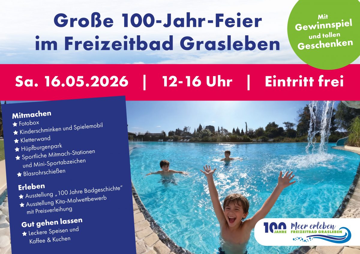 Nach der Wiedereröffnung des umfangreich sanierten Freizeitbades im letzten Jahr blicken Samtgemeindeverwaltung, Bäderteam und Förderverein Freizeitbad Grasleben jetzt mit Vorfreude auf ein ganz besonderes Ereignis: Am 16. Mai 2026 von 12:00 bis 16:00 Uhr wird mit einem großen Familienfest das 100-jährige Bestehen des Bades und gleichzeitig der Start in die Jubiläumssaison gefeiert. Der Eintritt wird an diesem Tag kostenfrei sein.